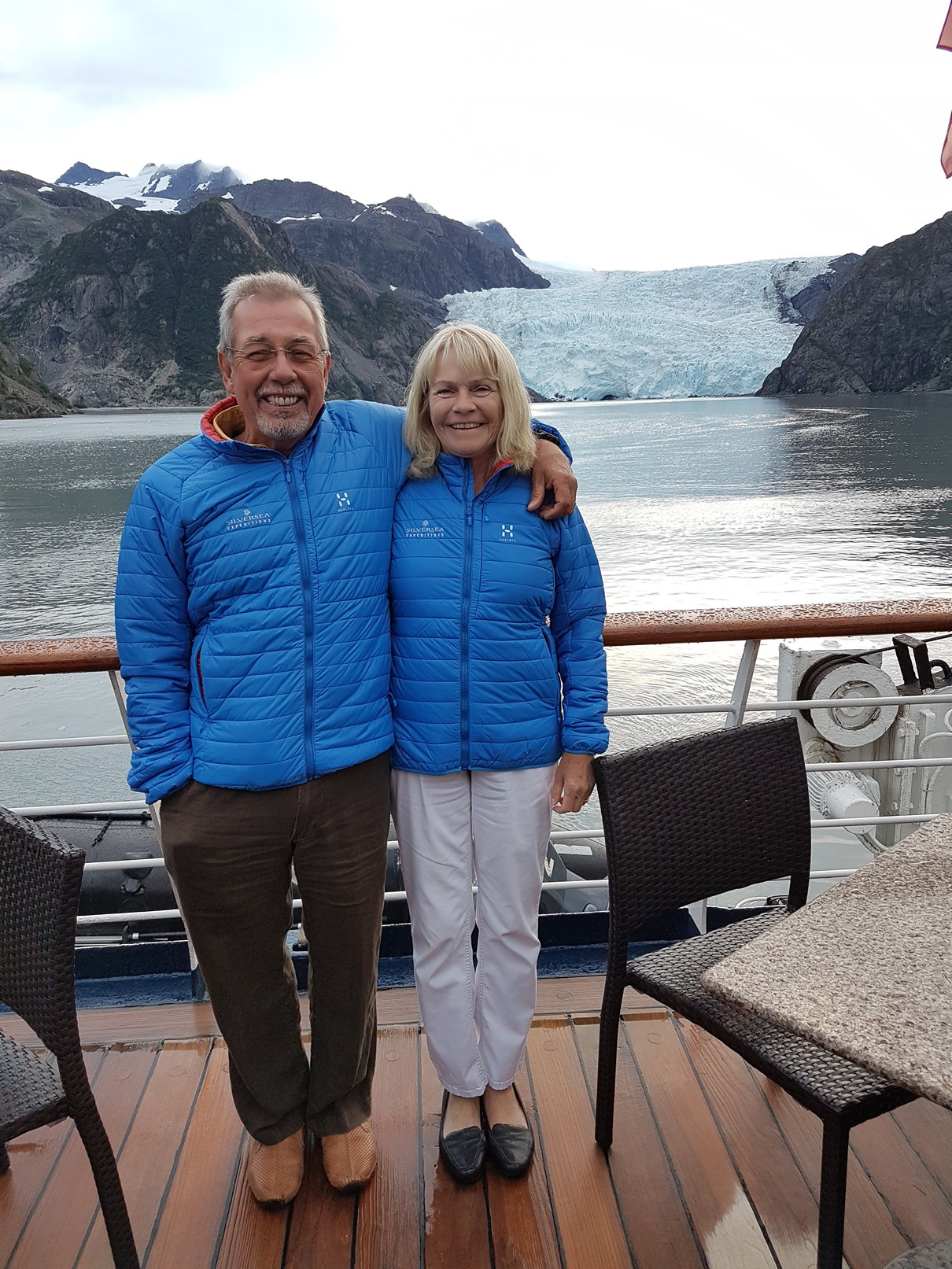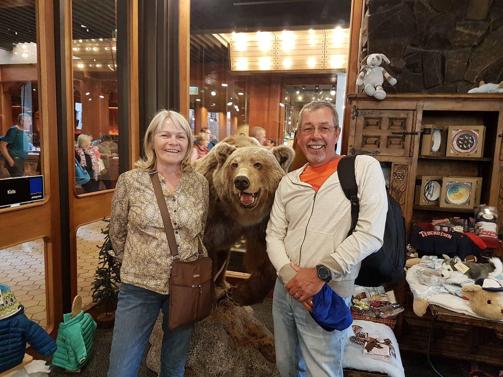 So this is us the first day - waiting to board the bus in Anchorage for the trip to Seward where our boat is docked. I'm sure we're not the only tourists to get our picture taken with this bear. It's a good thing we did as we won't see that many in the days to come.