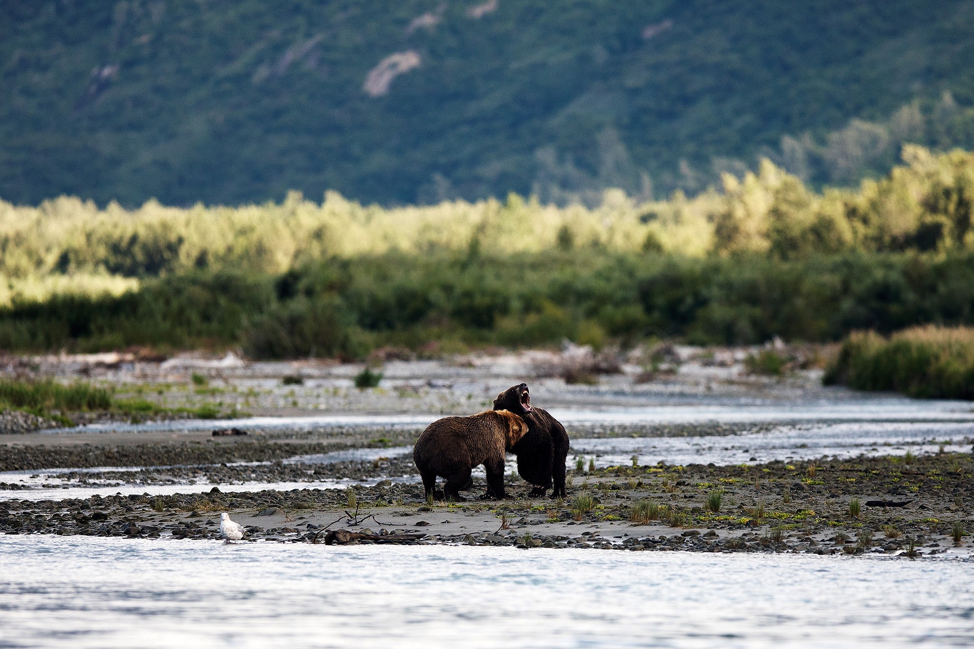 Here a couple brown bears meet and it at first looks like there could be trouble but they manage to work out their differences and get along.