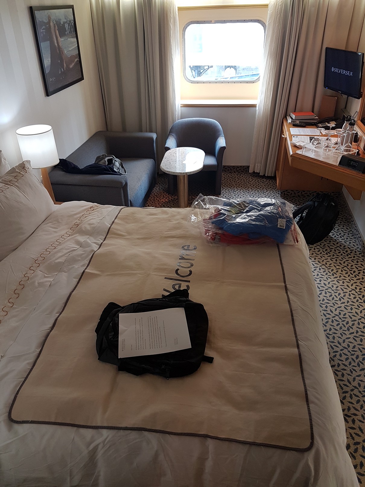 Our cabin. # 511. Small but functional. We don't spend much time in the cabin on these expedition cruises so it doesn't have to be huge. Just a comfortable bed and a functioning toilet and shower.