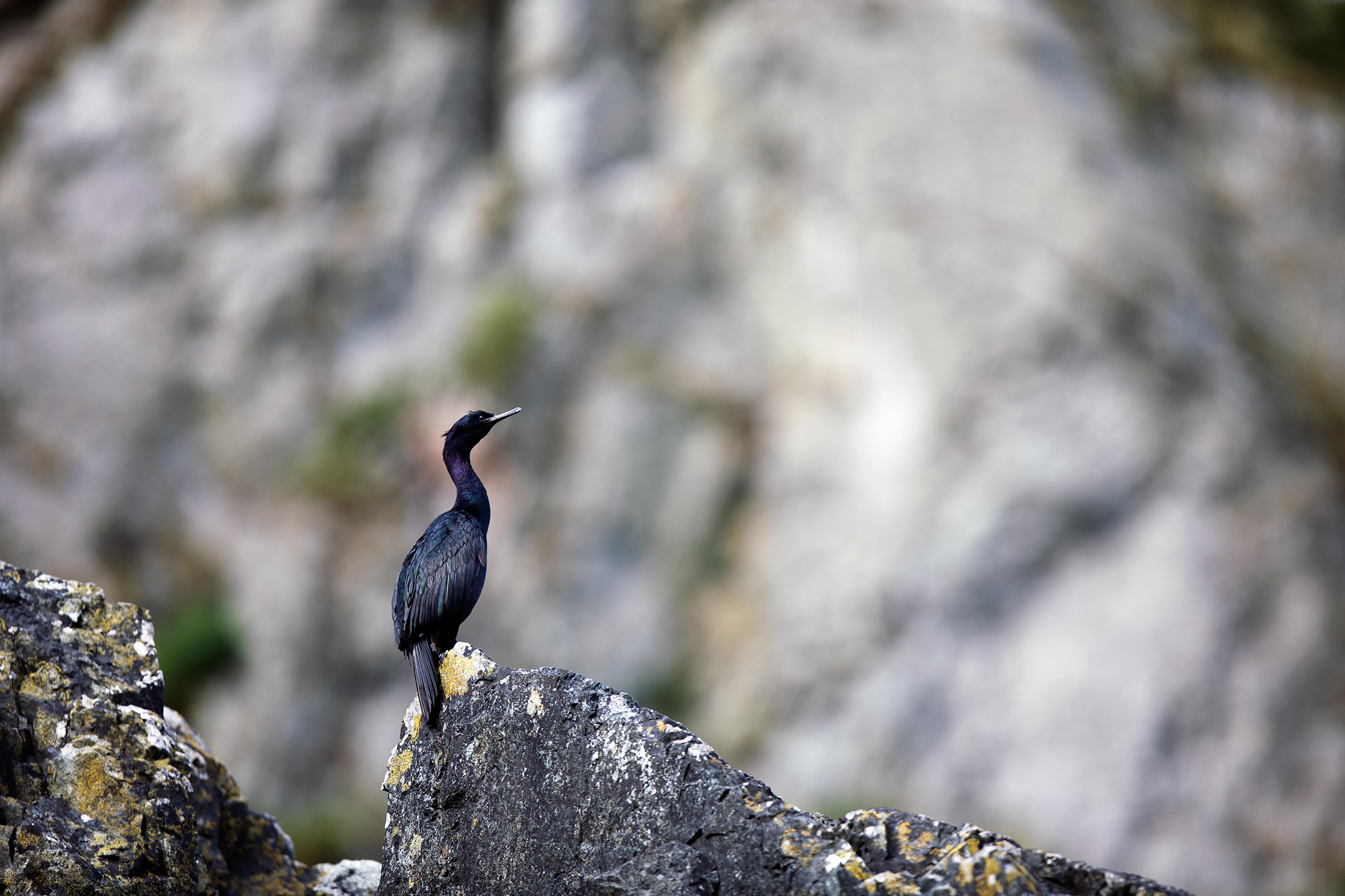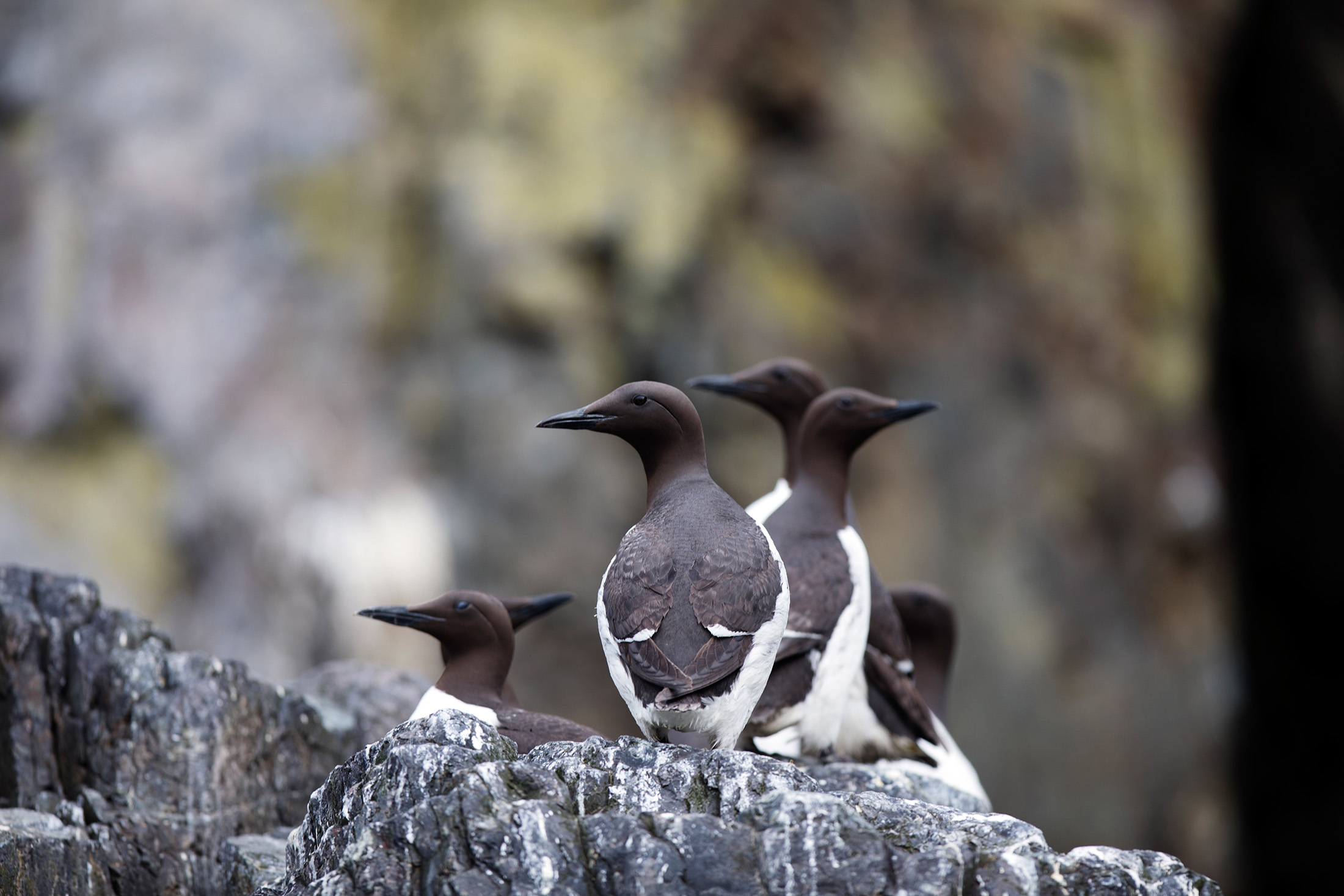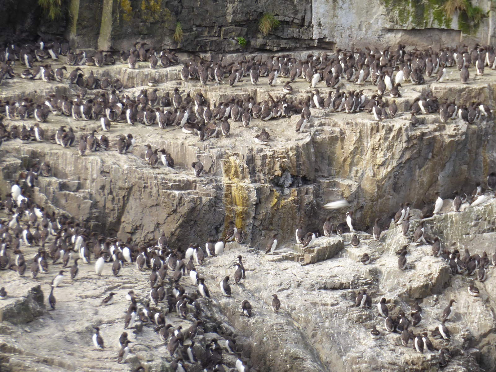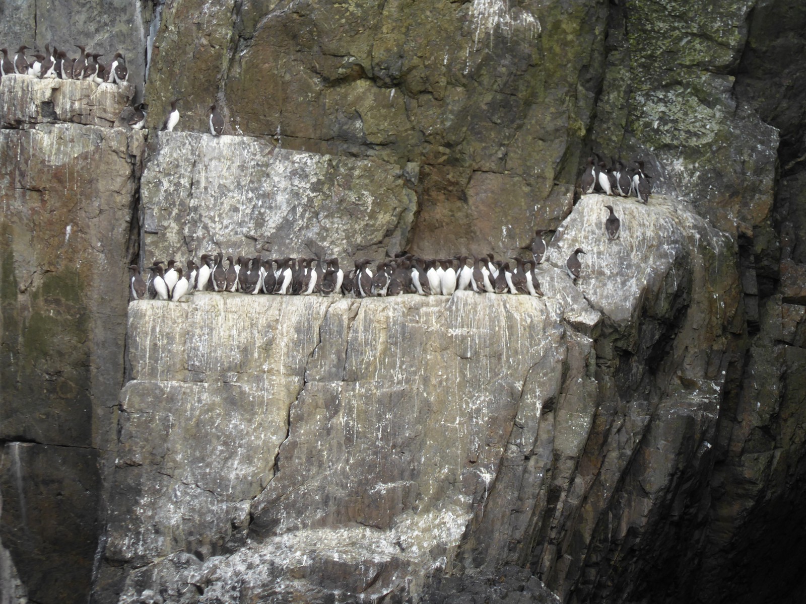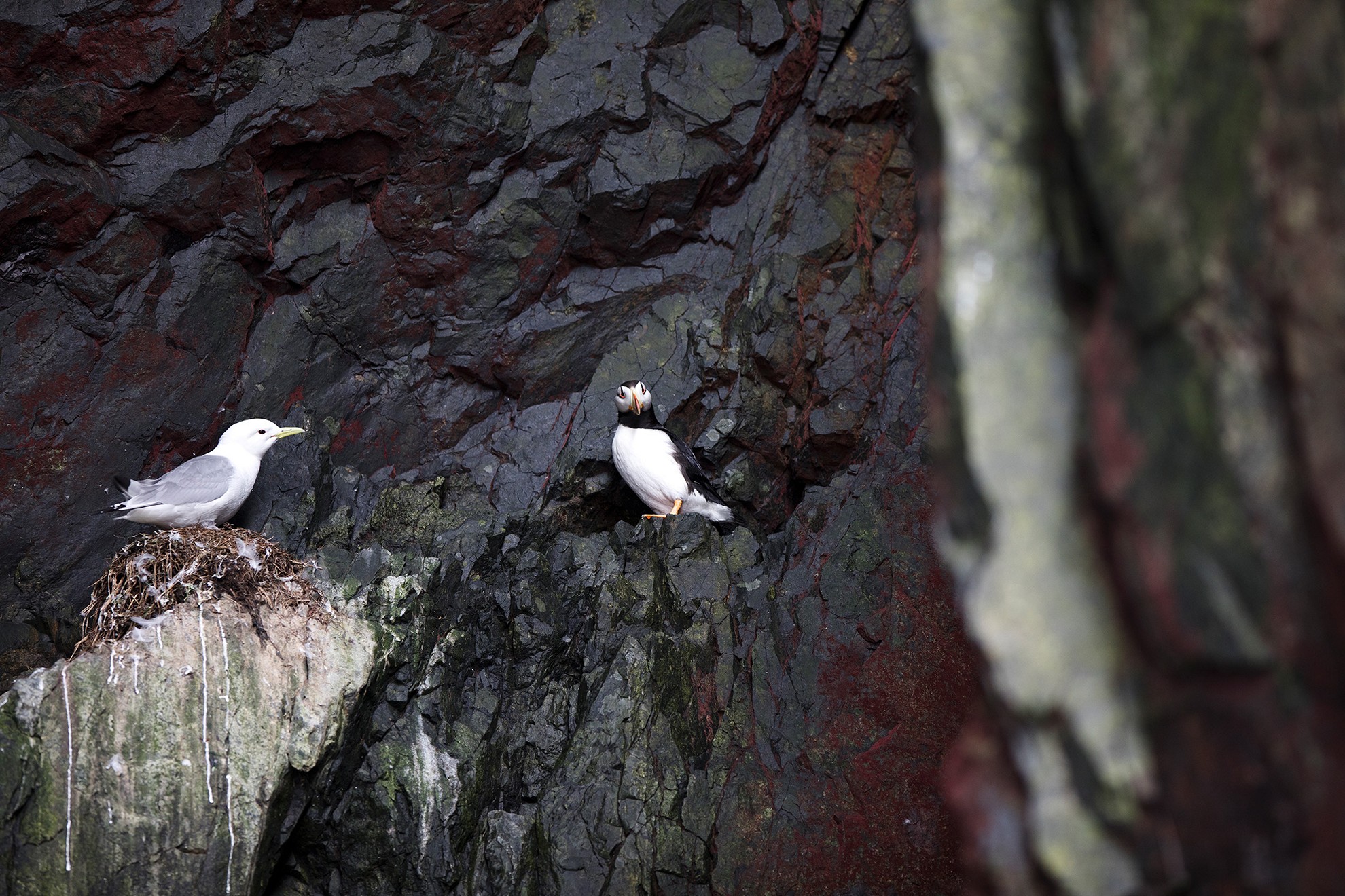 And a gull checking out a puffin. The puffin may have its nest just behind it. They like to find a crack in the rock to lay their eggs.