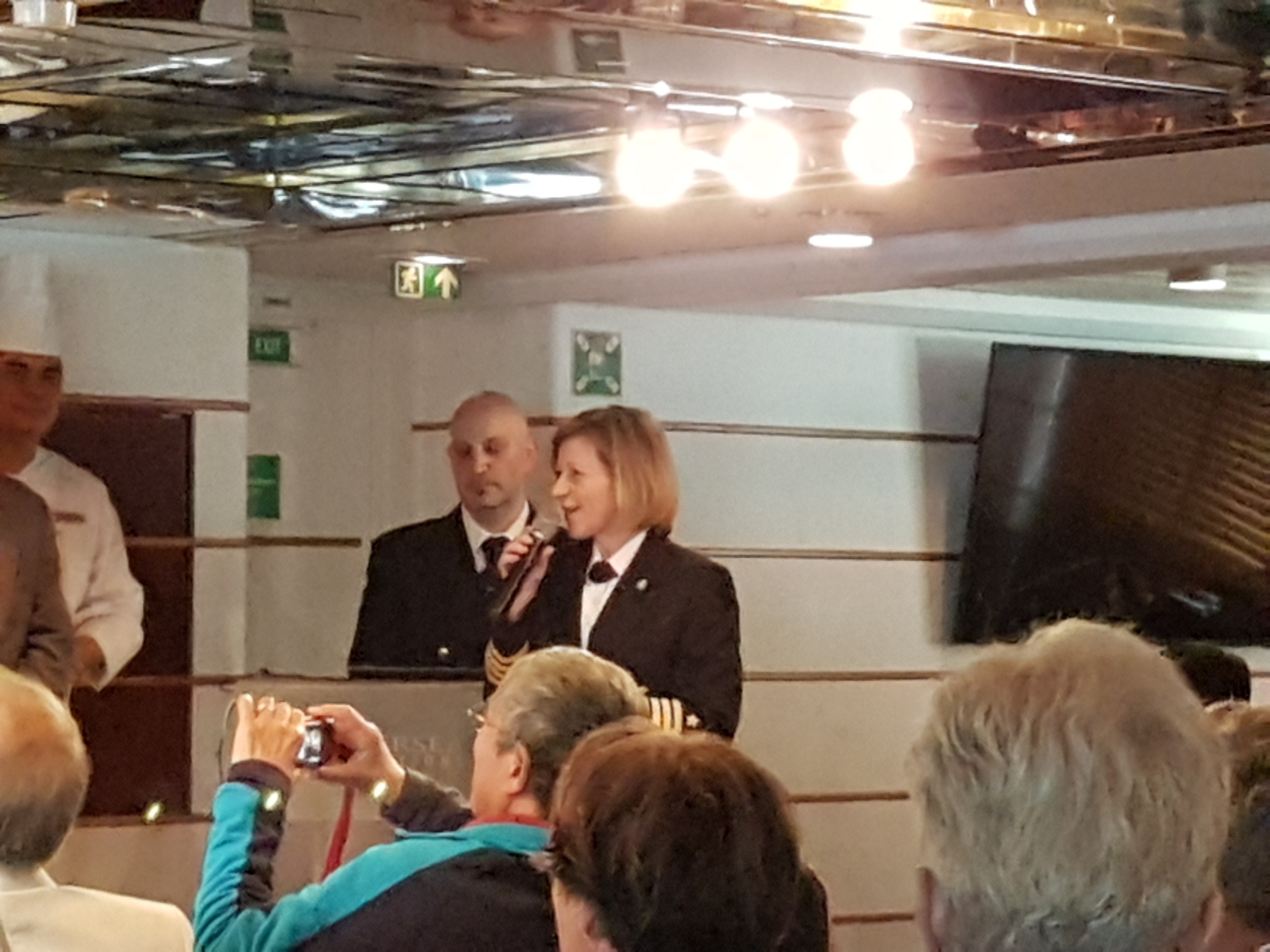 They also have a ceremony where all the bartenders, servers, room cleaners, etc. are brought to the stage and we all give them a round of applause. That's the captain to the right of the stage. Maggie Ettlin is her name and she's Swiss. Switzerland is a land locked country so it is very strange that she would choose to be a seafarer but she definately is.