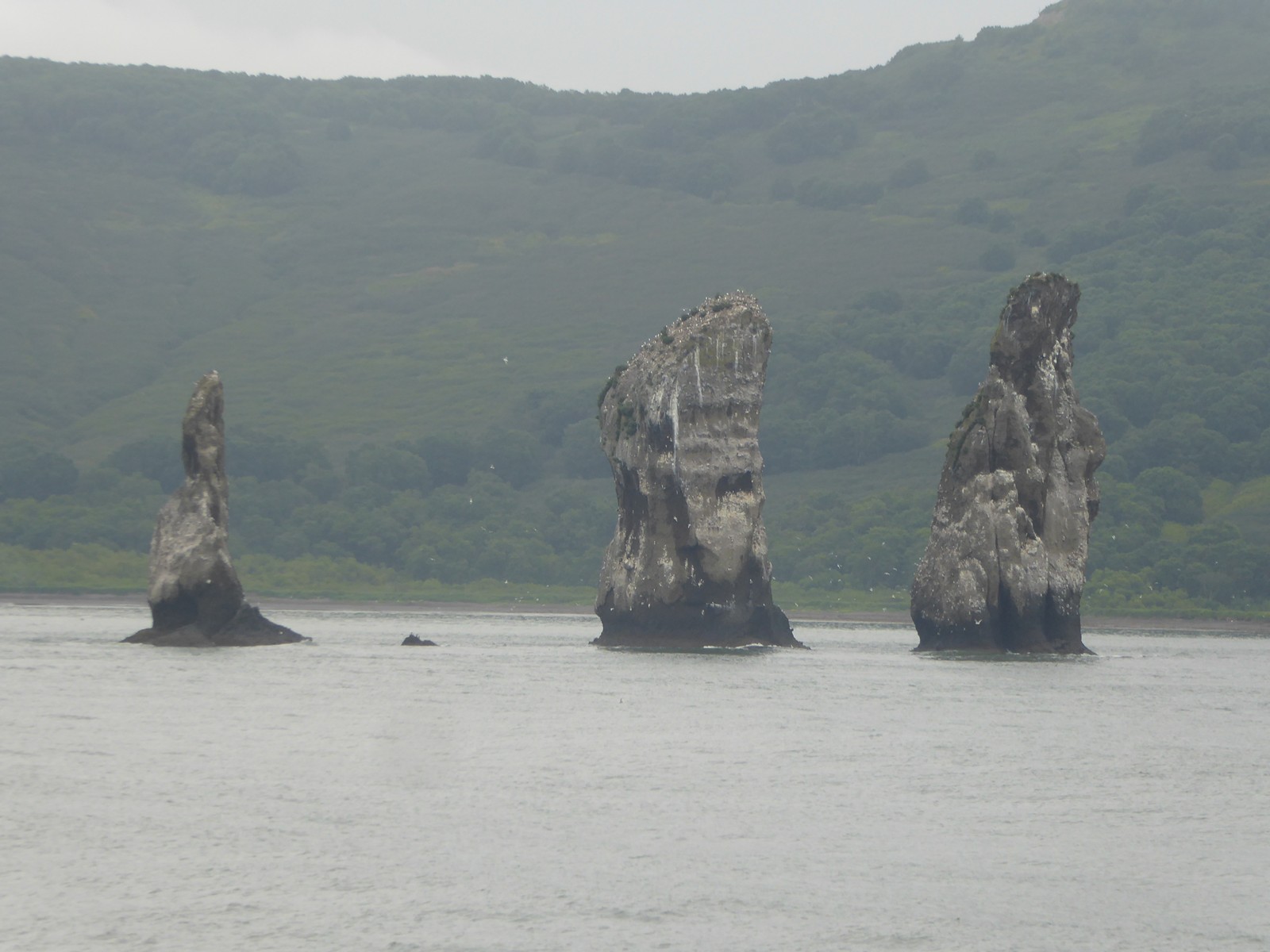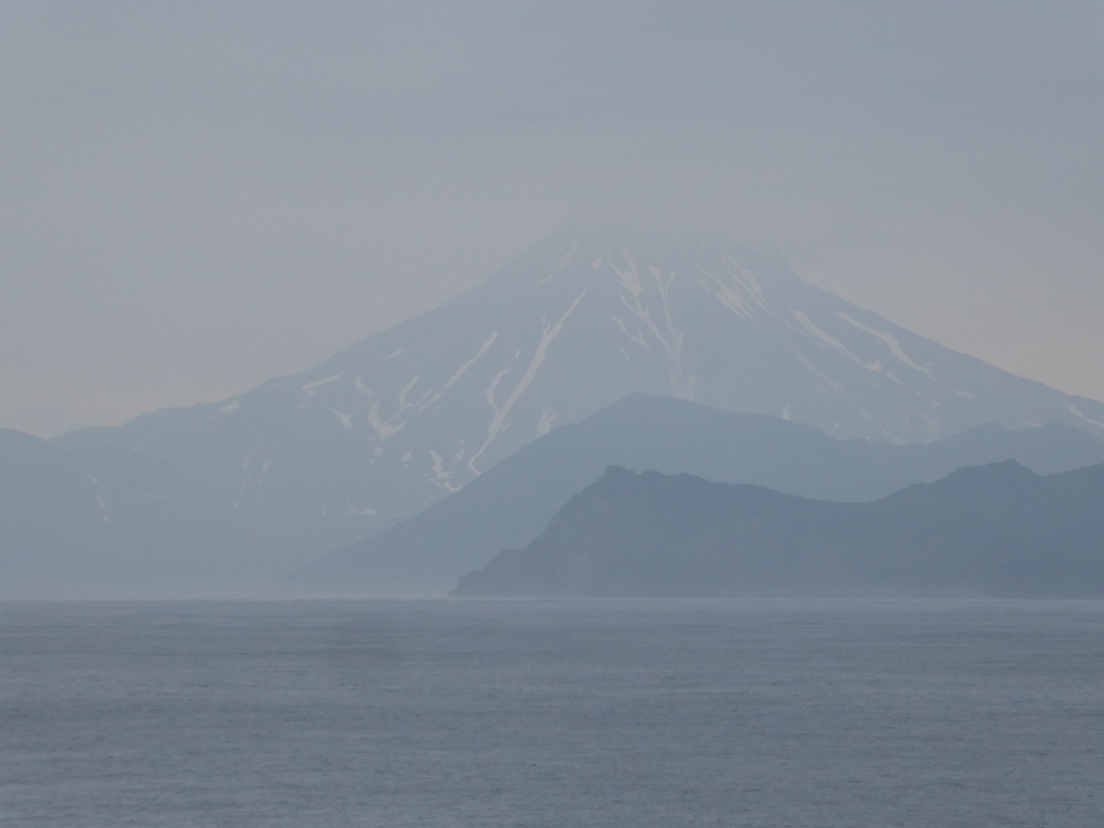 The city of Petropavlovsk-Kamchatsky is surrounded by volcanoes. There's a huge one on the way into the harbour but the weather is so shitty you could just barely make it out.