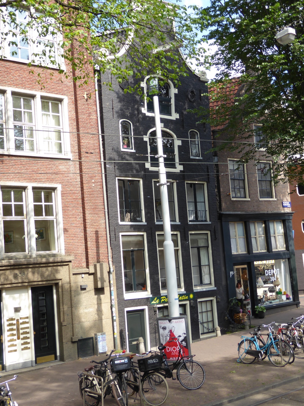 One thing you'll see a lot in Amsterdam is houses where the top protrudes outward - check out the black house below. Apparently this was intended to make the house look bigger and to also make it easier to lift material into the house using cranes. See next pic.