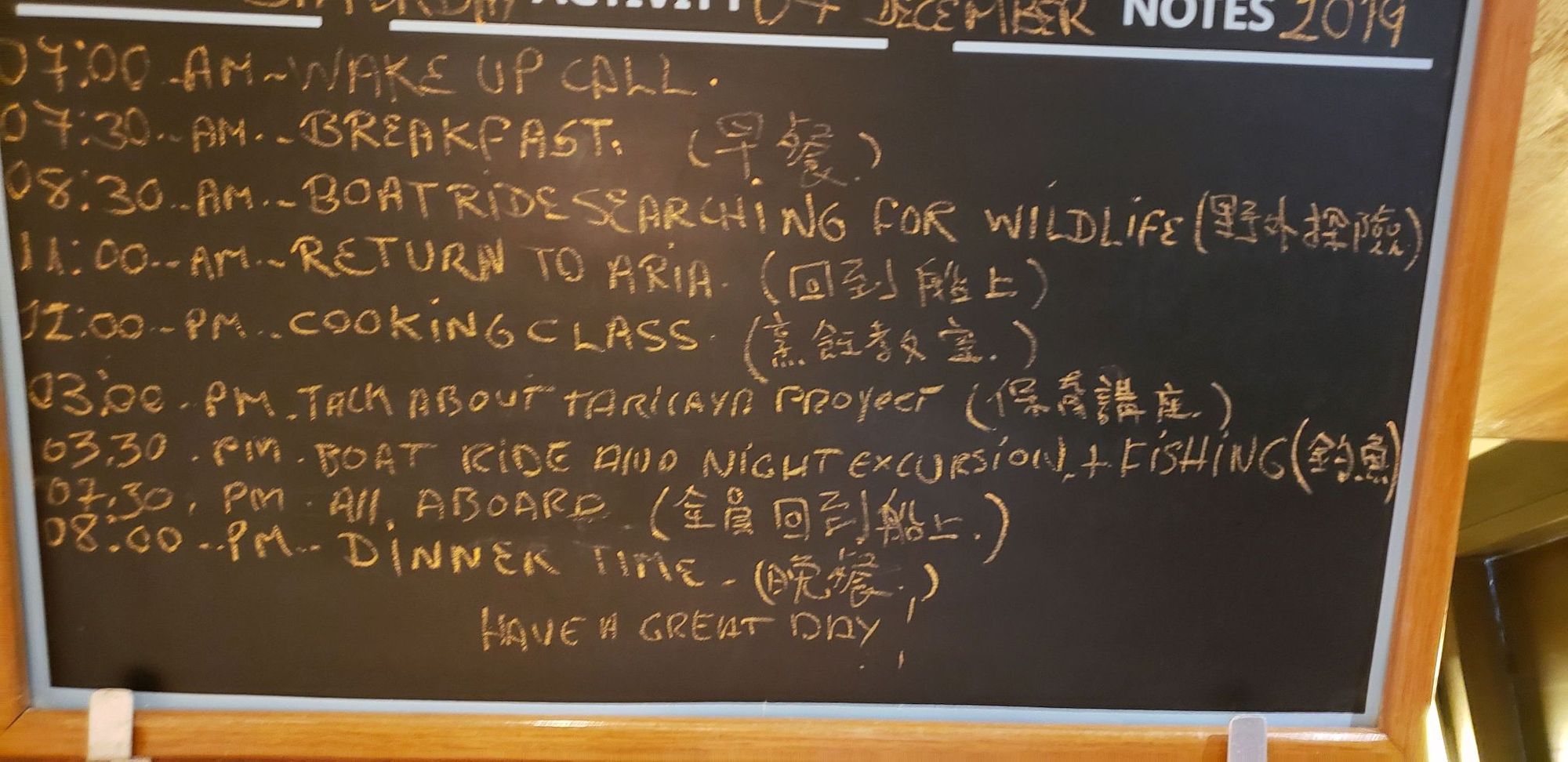 Each day someone from the crew wrote our daily activities on a blackboard outside the dining room. One of the Chinese chaperones would then translate and ad the same info in Chinese.