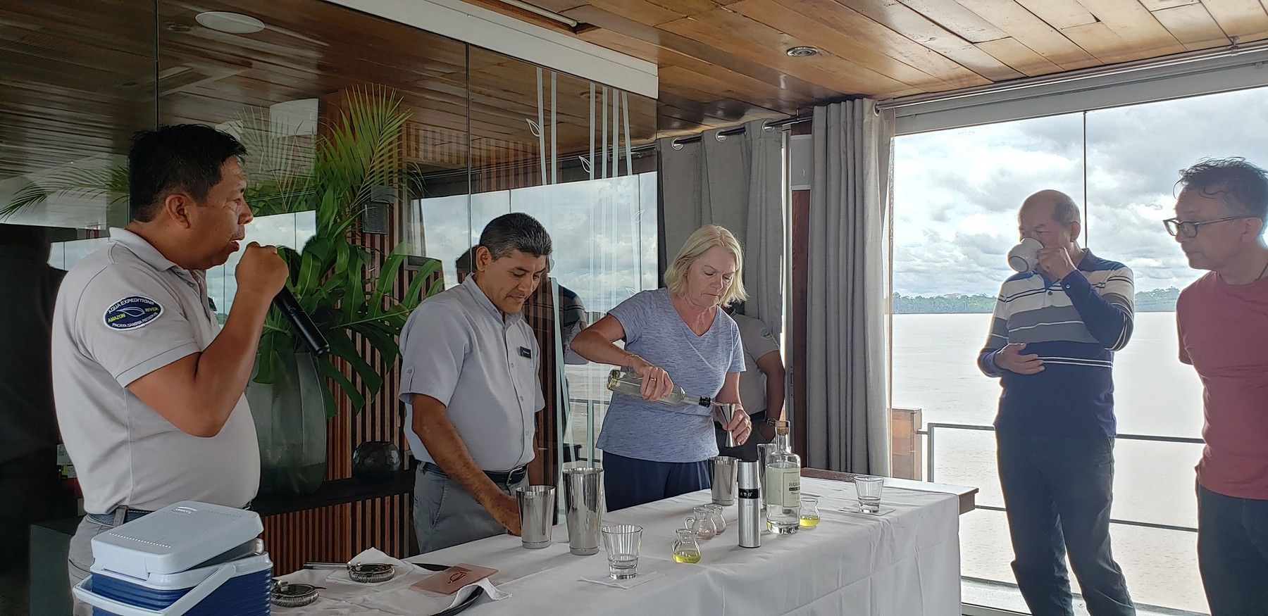 Another day bartender Nelson did a demonstration showing how to make a Pisco Sour. Terri was chosen to assist.