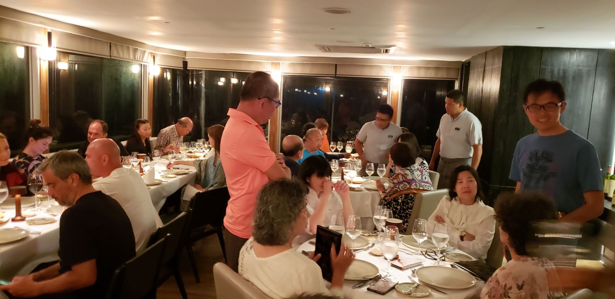 This is a shot of the dining room. Small but functional. The two oriental guys standing up are Joe and Theo. They were the "chaperones" of the Taiwanese group. They both turned out to be good guys. Joe wanted Taiwan to reunite with mainland China and Theo was dead set against it. It's good when people can get along even when they have differing views. The two standing guys in the background with white shirts were two crew members: Bill and Percy.