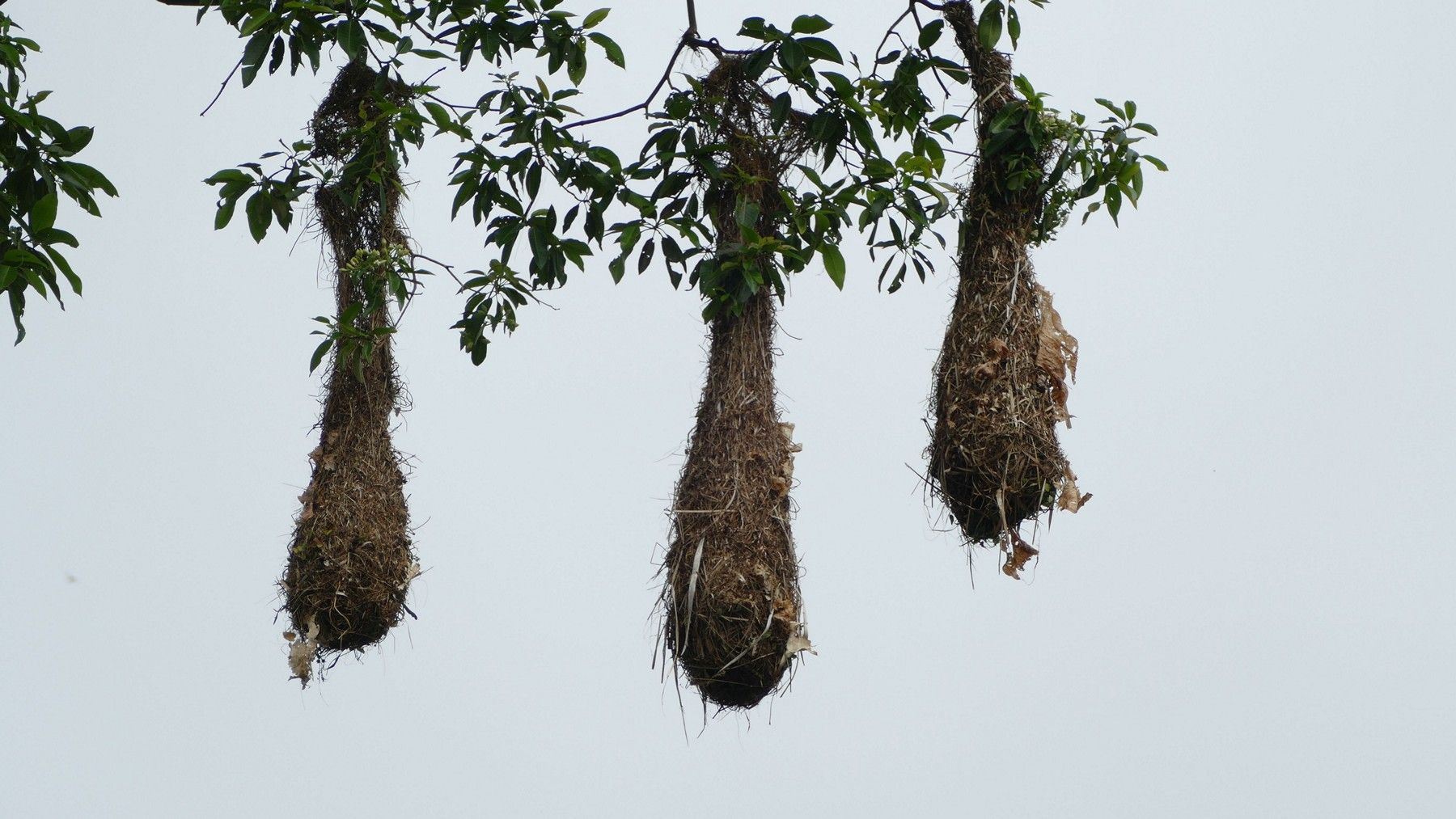 The sack things hanging down from the tree branches are birds nests.