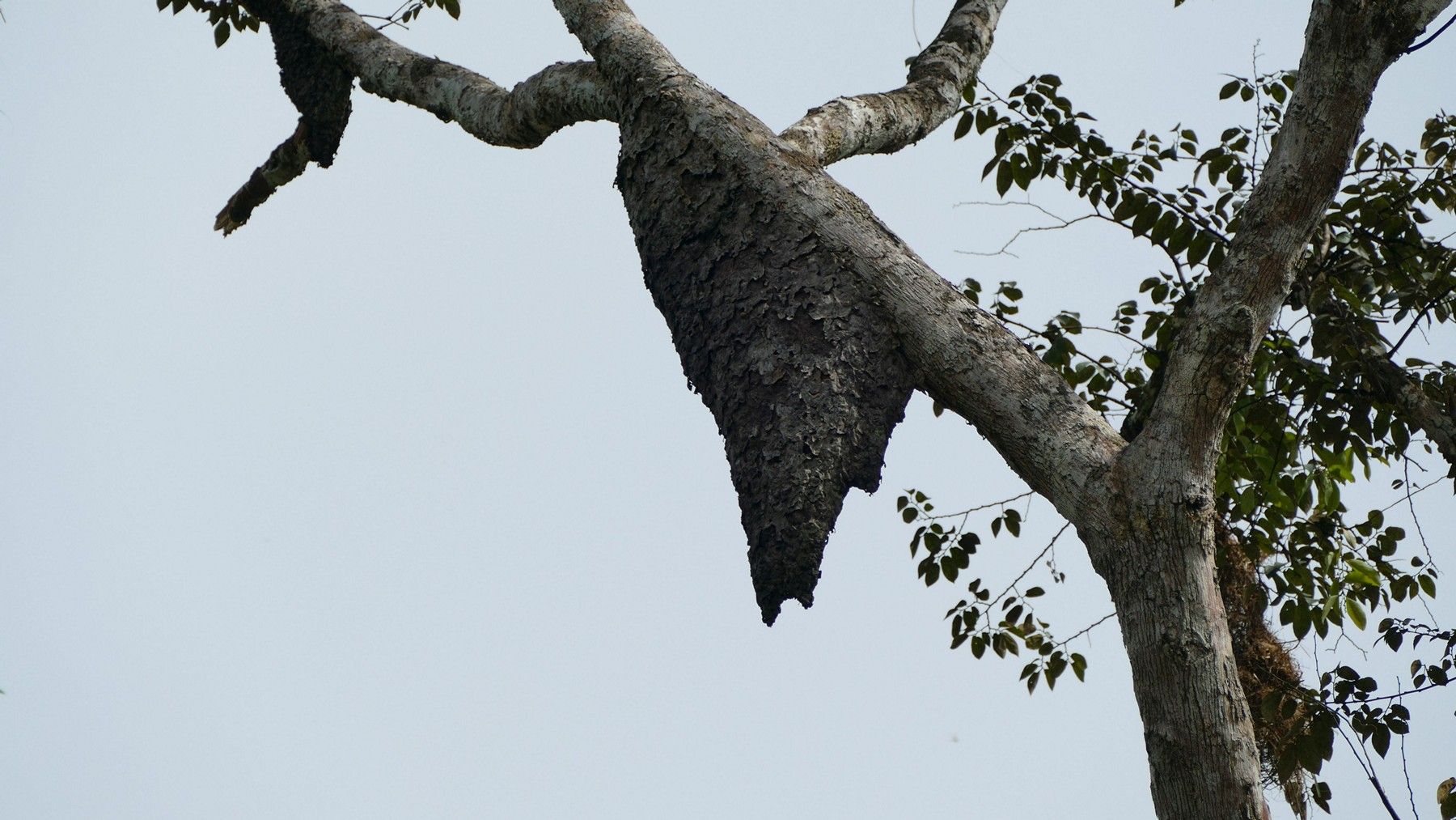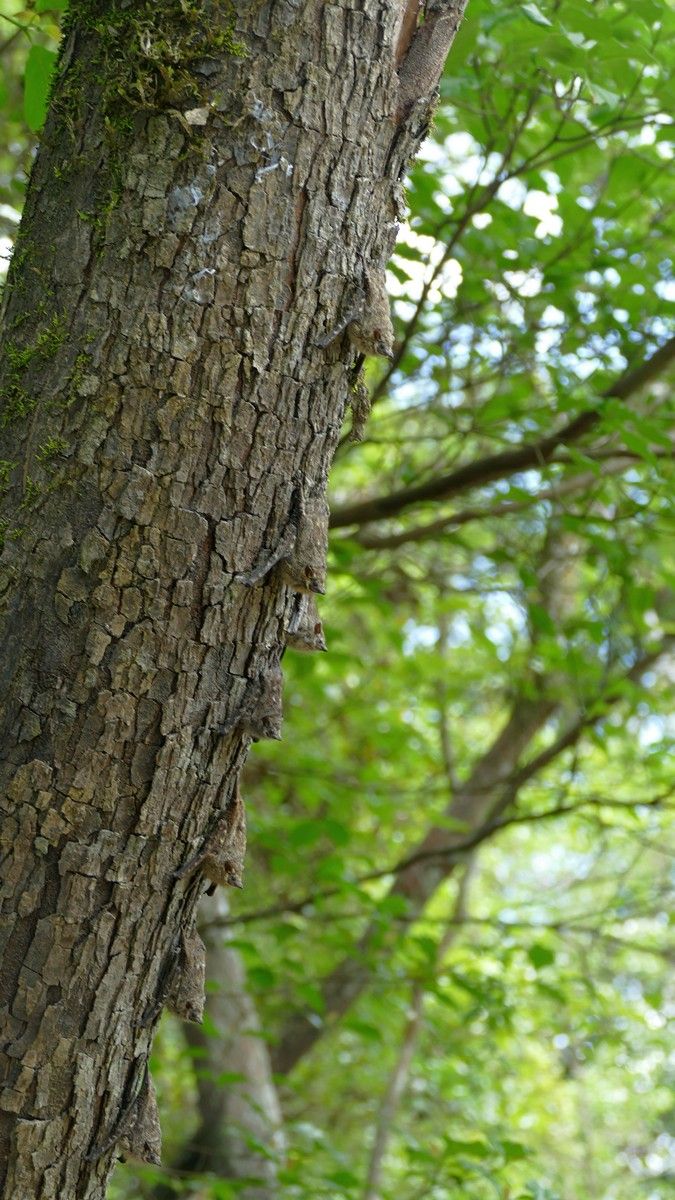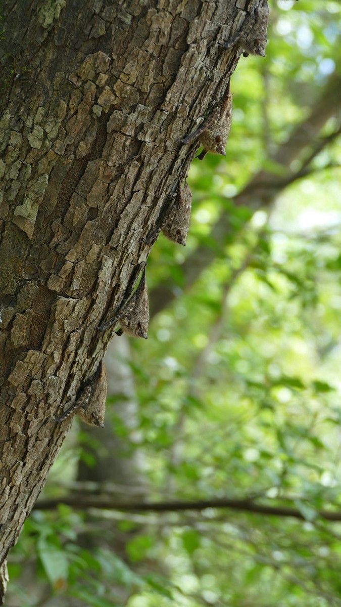 Later we were out looking for wildlife again and we came upon these proboscis bats. Look close - they're hard to see. There were about eight to 10 hanging upside down on the tree trunk. When we got close they all started vibrating so they kind of looked like a snake. When we got closer they all flew away.