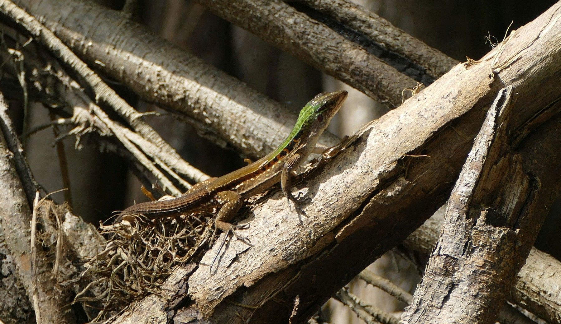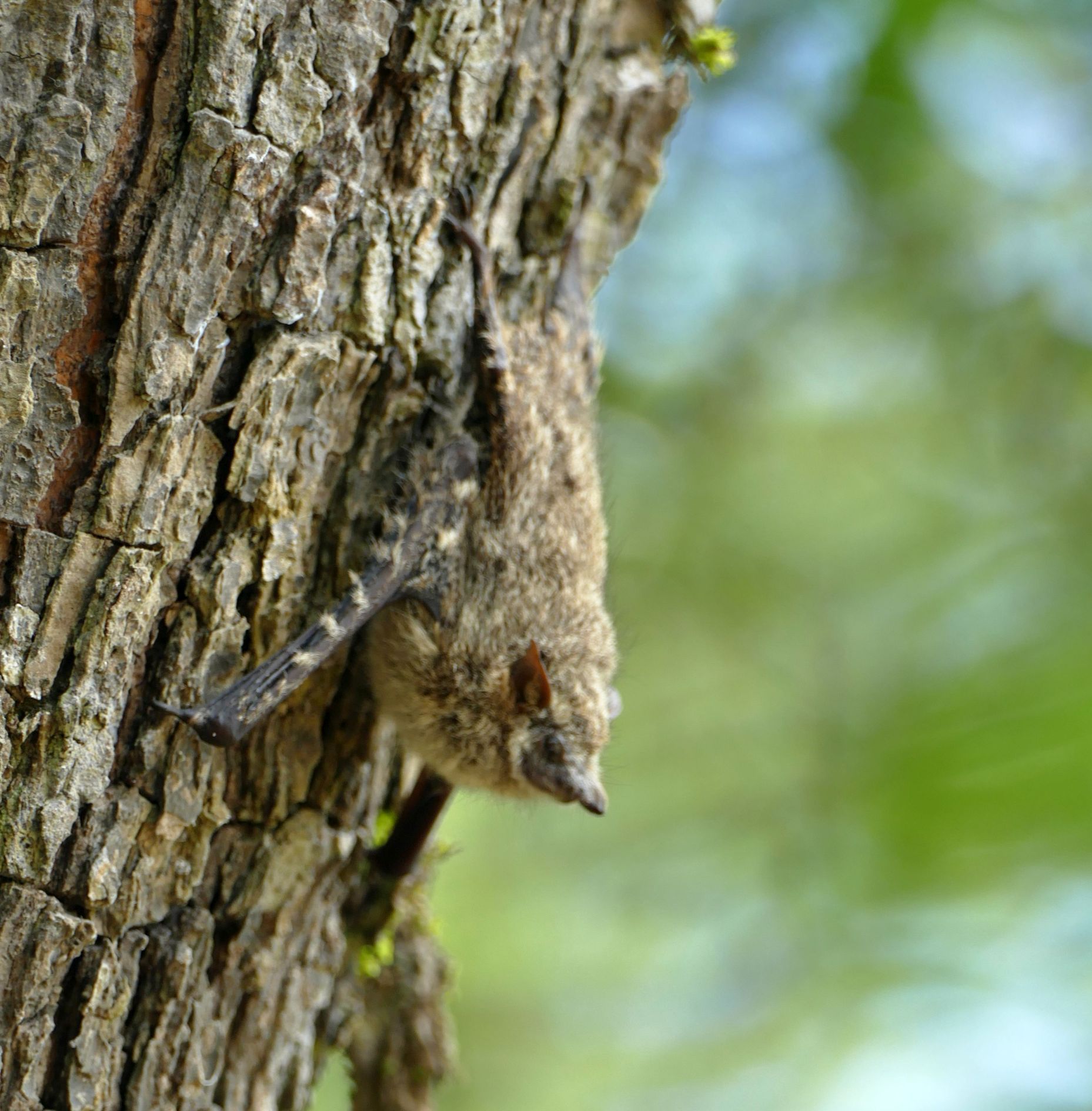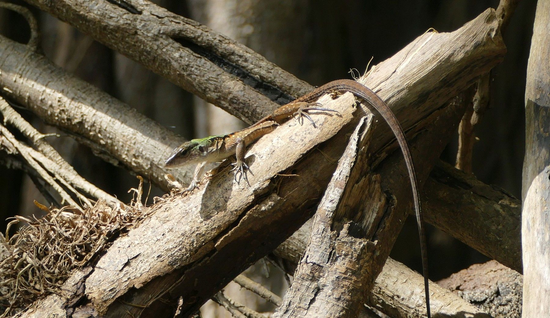 Later we were out looking for wildlife again and we came upon these proboscis bats. Look close - they're hard to see. There were about eight to 10 hanging upside down on the tree trunk. When we got close they all started vibrating so they kind of looked like a snake. When we got closer they all flew away.