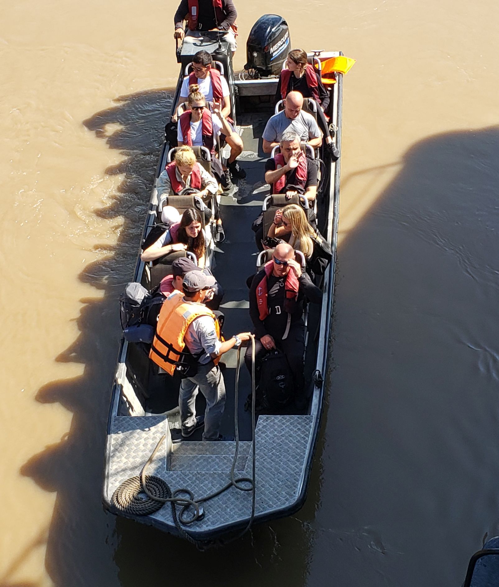 This is one of the skiffs. There are 12 people in it plus the guide and the skiff driver. There are some Ukrainians and some Chinese and the noise generated by this mob would scare away most critters. The Ukrainians never shut up - they talked amongst themselves continually. If you put rocks in a blender it sounds like a bunch of Ukrainians talking.