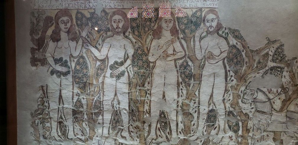 We then went to a coptic christian museum which was interesting but museums aren't our favourite activity. Didn't take too many pics at the coptic museum but the one below interested me. It shows Adam and Eve before and after the apple in the Garden of Eden. On the right they are innocent and have no fig leaves as they do on the left. On the right Adam has no external reproductive parts nor does Eve. Bit on the left he may have "grown a pair" and covered them up and Eve has grown a weird looking pair of boobs. At least she grew two and not one like many of the Egyptian women we've seen lately.