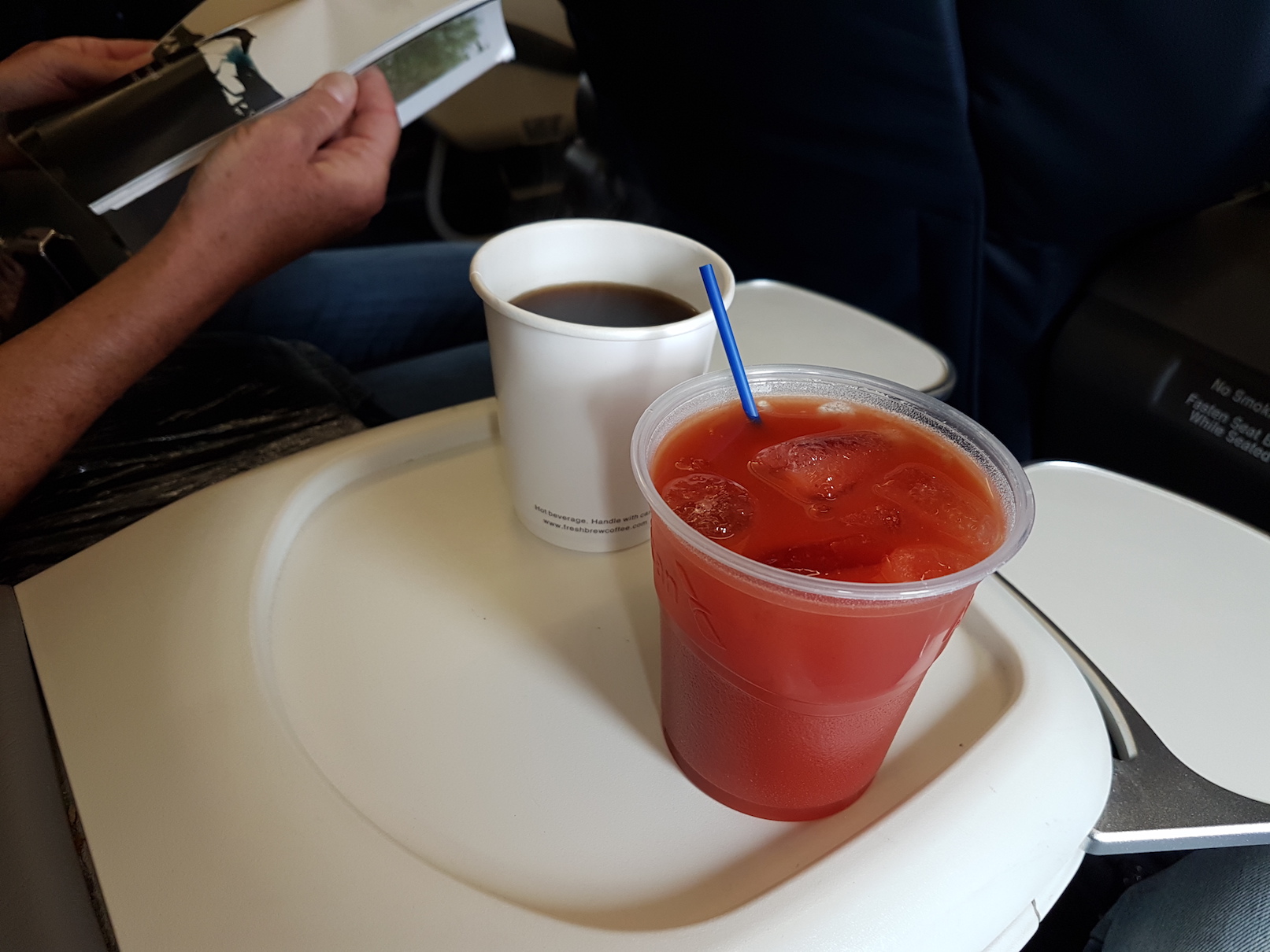 Breakfast on board the plane was the usual: a coffee for Terri, a Bloody Mary for me.