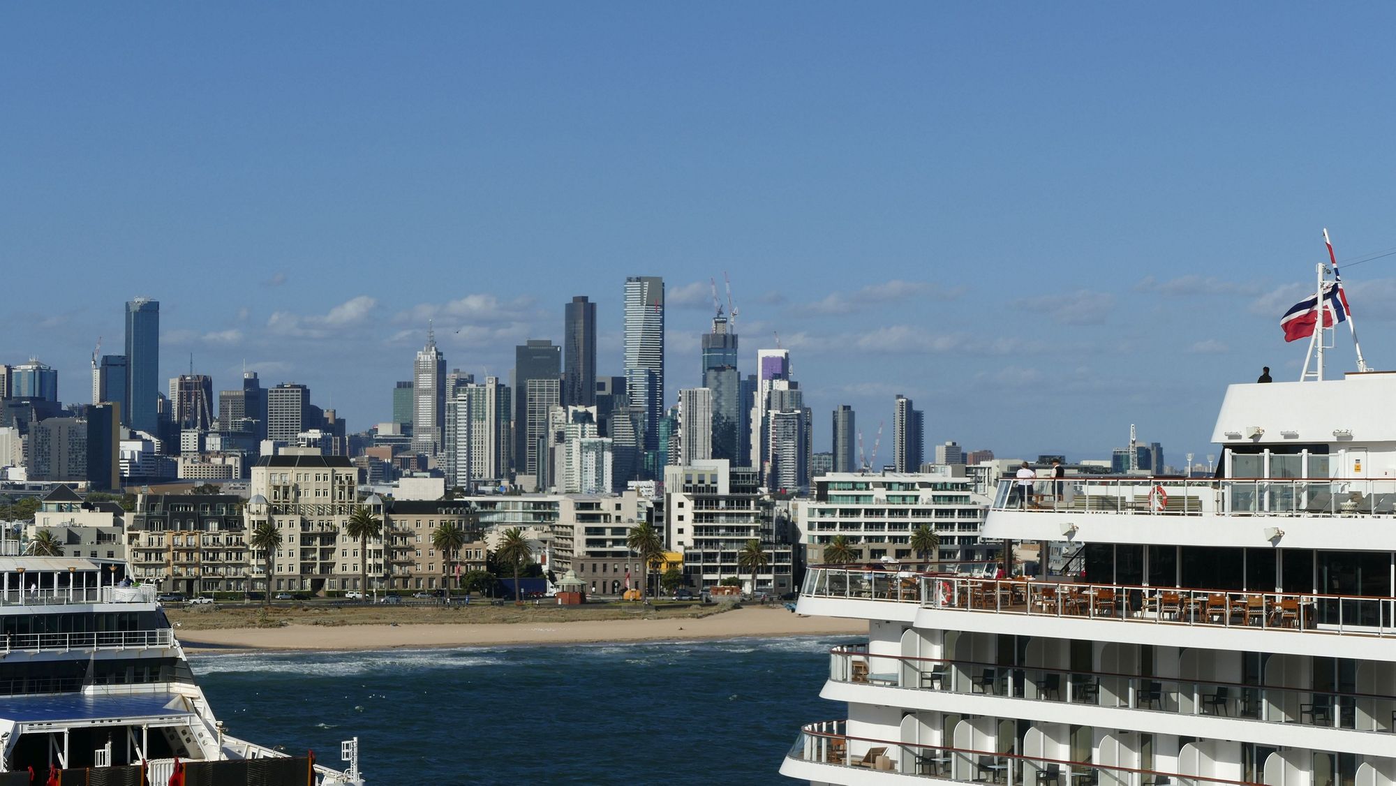 A shot of the city taken from our ship. We are docked next to another cruise ship. It must be an NCL ship as that is the Norwegian flag flying.