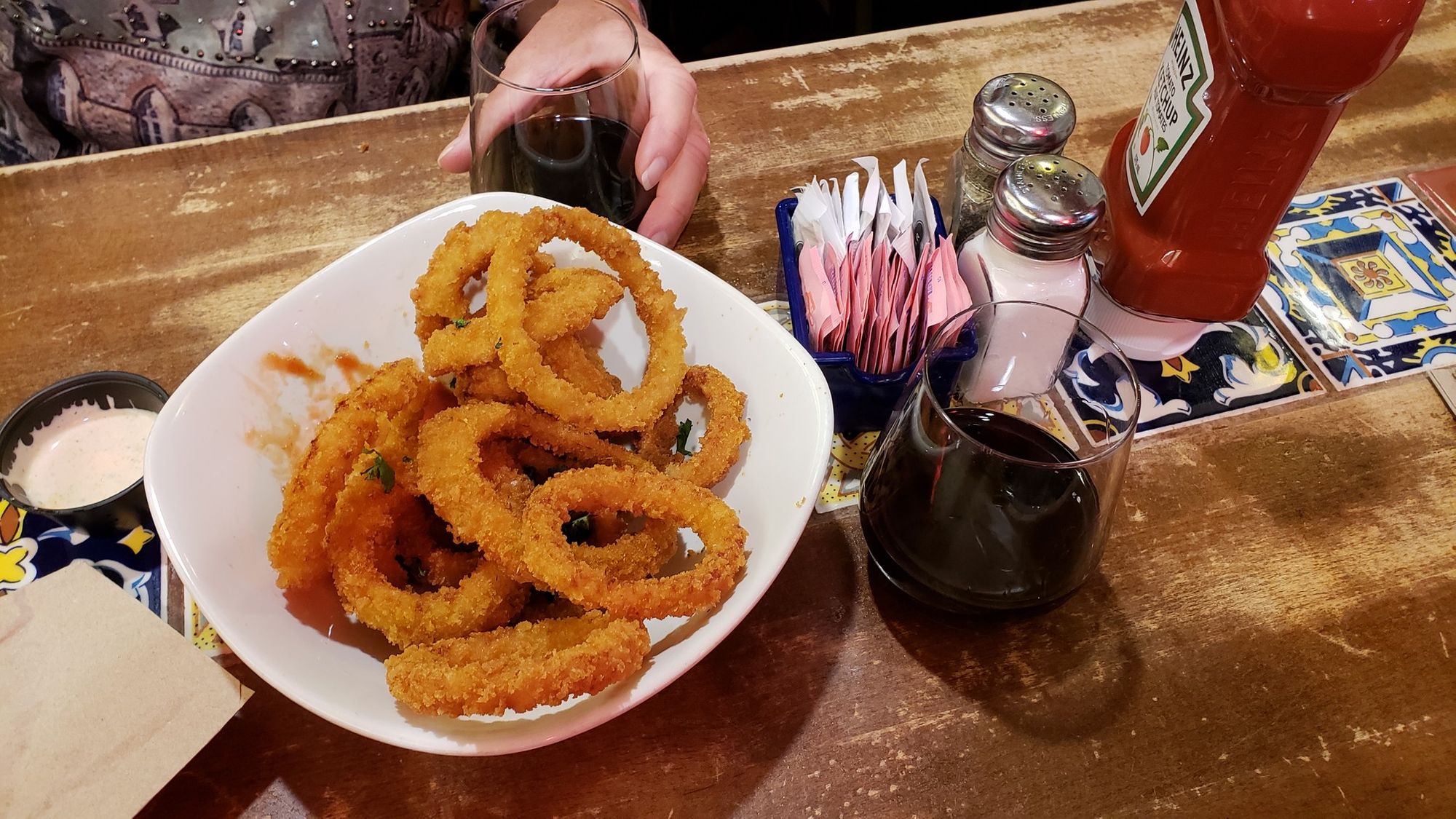 So to prepare for the flight we need to make sure that we have eaten properly and had enough beverages as well. Wine and onion rings....a fine combination!