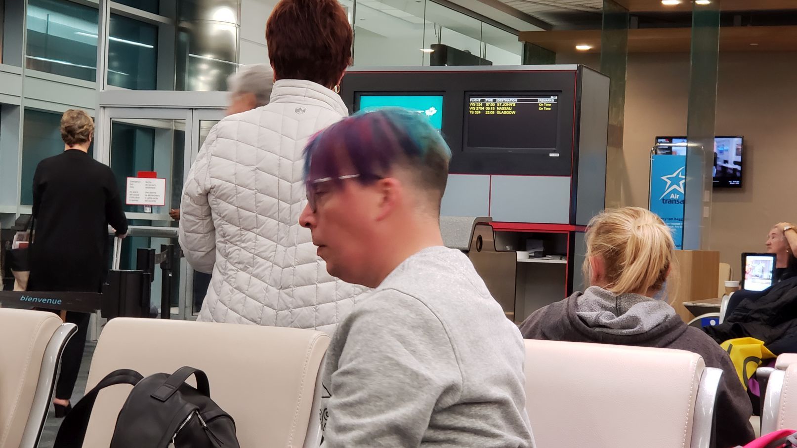 And one of the reasons we love flying so much is the goofy looking fuckers we see in airports. Look at this putz - purple hair, turquoise blue hair! Unreal!