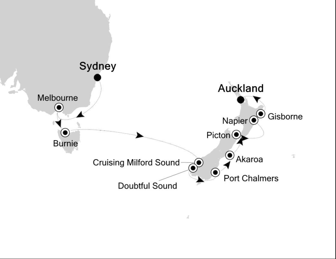 Our New Zealand cruise started in Sydney and then to Melbourne and then to Tasmania. I've covered those stops under the Australia cruise blog. The pic below shows our trip.