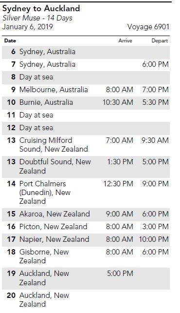 So, according to the cruise itinerary shown below, after Burnie, Tasmania we have two days at sea (January 11 and 12) , as it's quite a ways from Burnie to New Zealand, and the we have a day just cruising up and down Milford Sound and then another day cruising around Doubtful Sound. I was quite looking forward to seeing both sounds as we'd run into people on past cruises who compared them to the Norwegian Fjords saying the New Zealand Sounds were much more majestic. So I really wanted to see them.