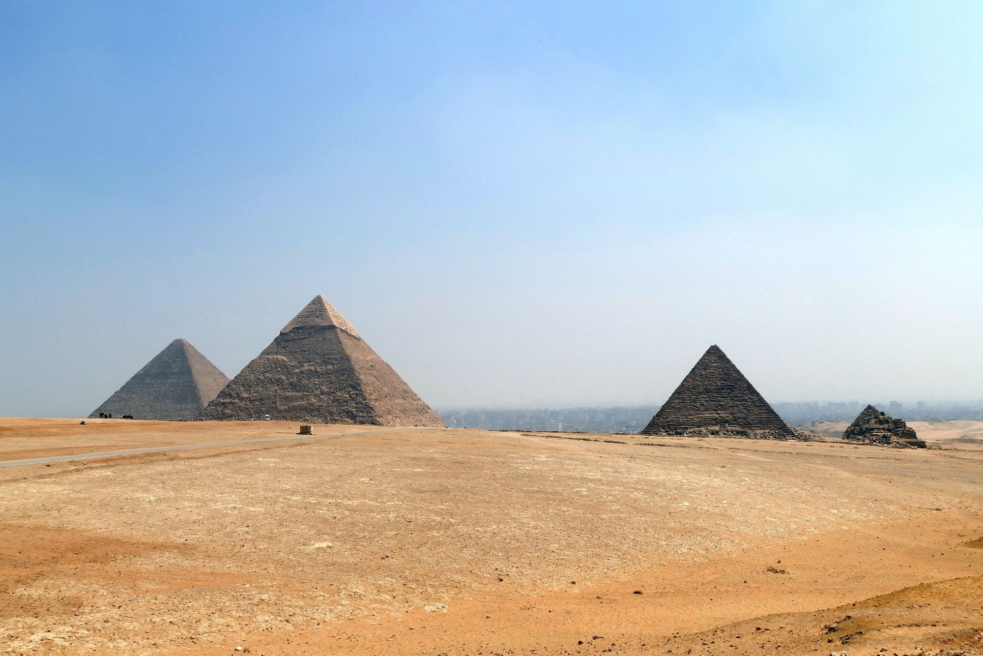 From another angle: The Great Pyramid of Giza is the one on the left. It's actually smaller now than the one in the middle due to wind / rain erosion over all the centuries. Both pyramids are over 4,500 years old.