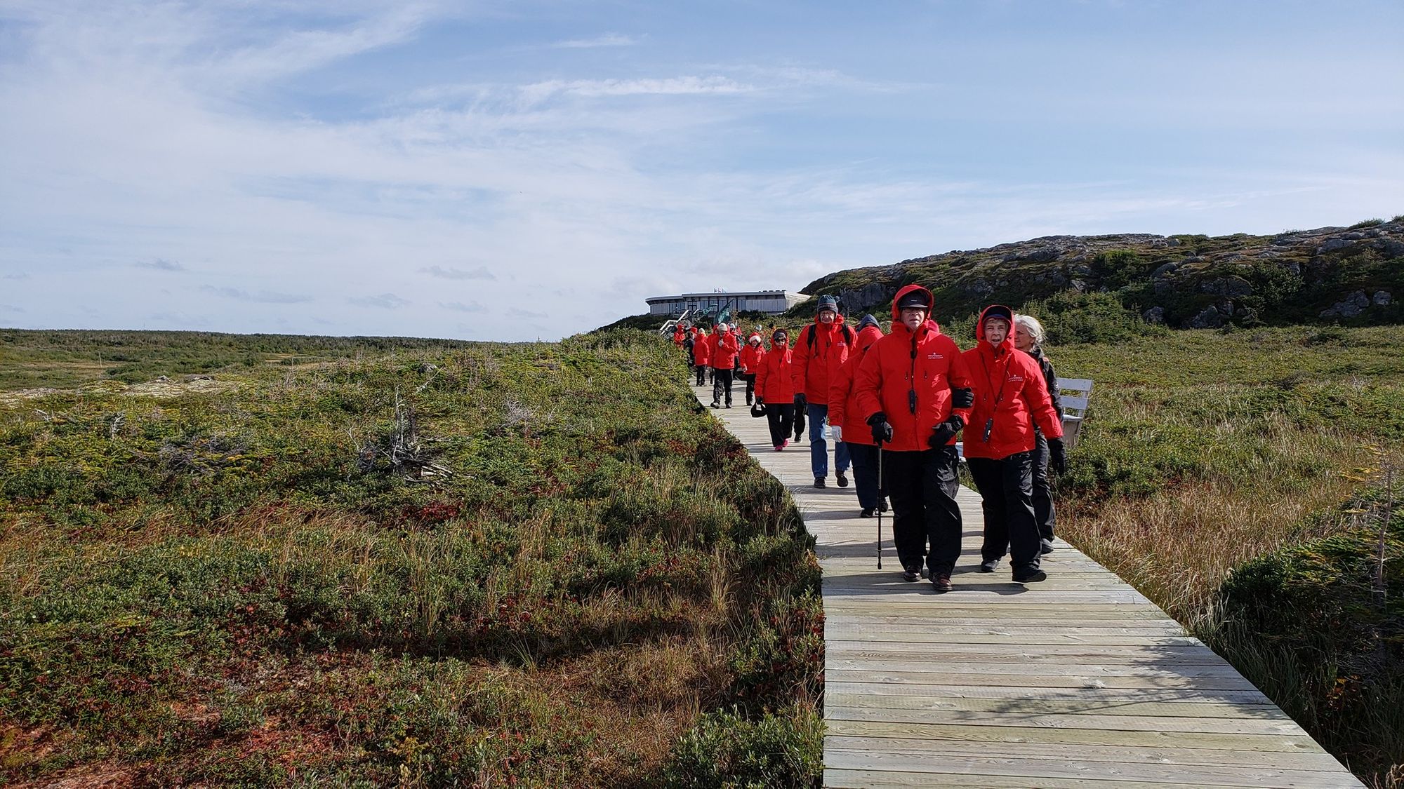 So this is our group on the way to look at the ancient Norse site and if we look cold it's because we were. This was the coldest day we had. It looks nice and sunny but it was cool and windy. Lucky Silversea has given each of us a parka.