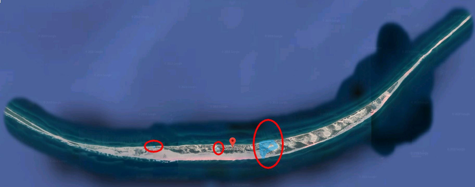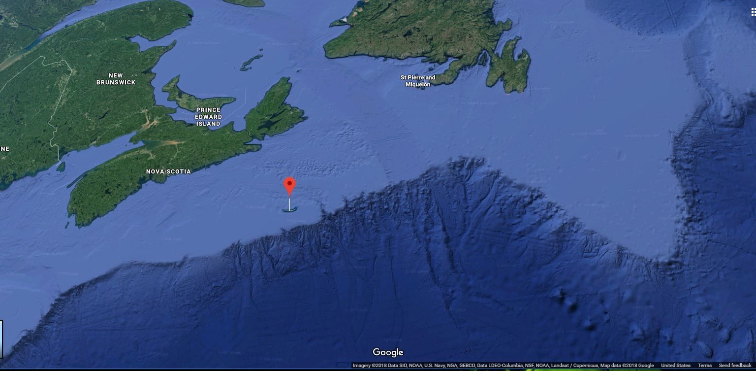 The map below shows the location of Sable Island. Quite a ways from Nova Scotia (about 160 km or 100 miles) and just on the edge of the continental shelf.