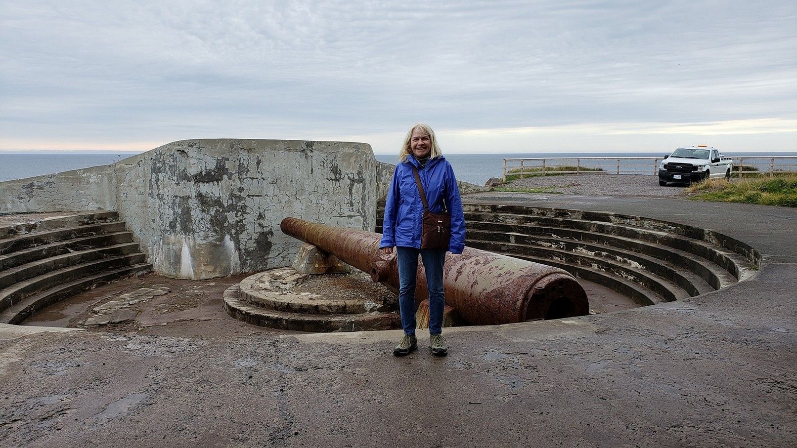 Terri in front of one of the big guns. During the war they had a huge hydraulic device that would raise the gun above the cement block so that it could fire and then it would be lowered down again.