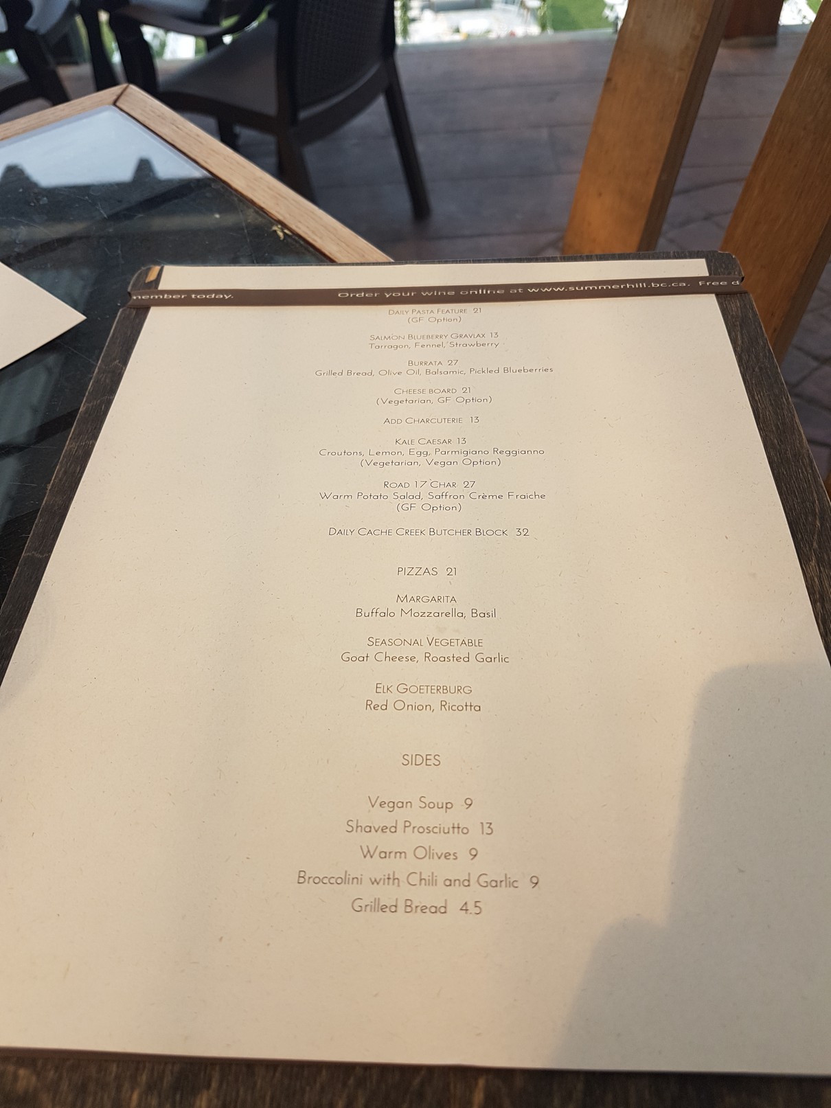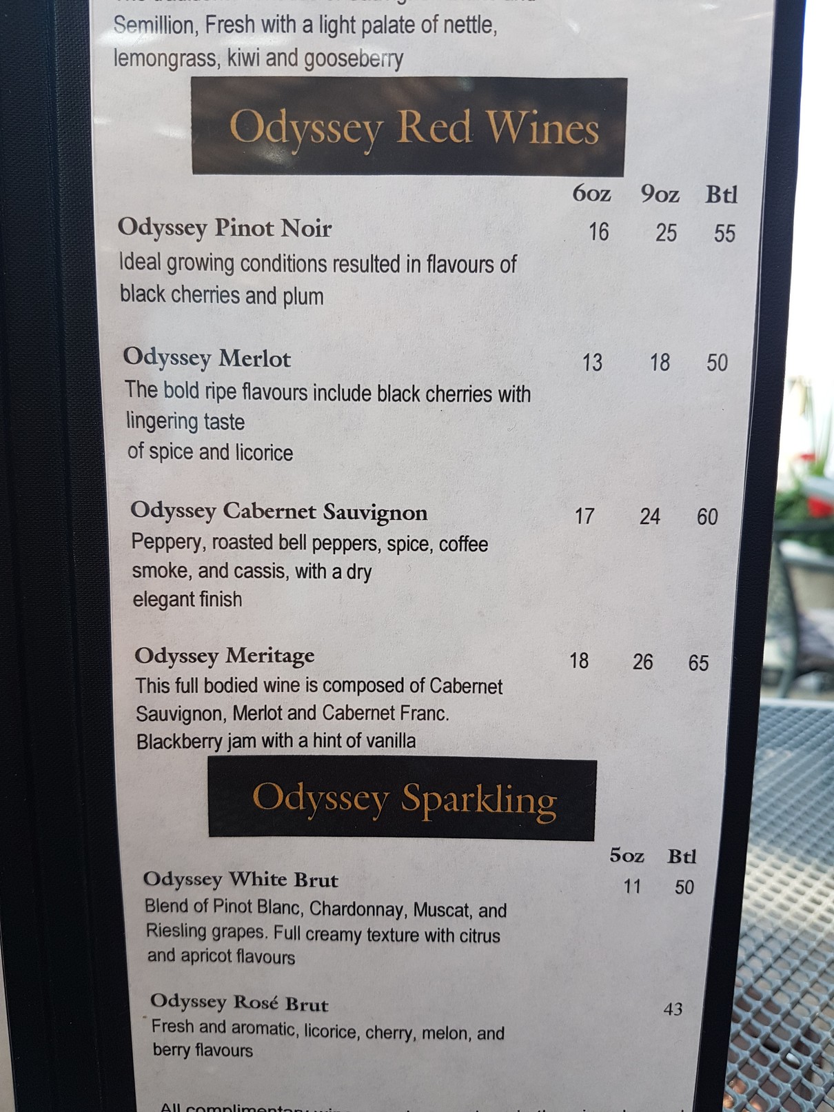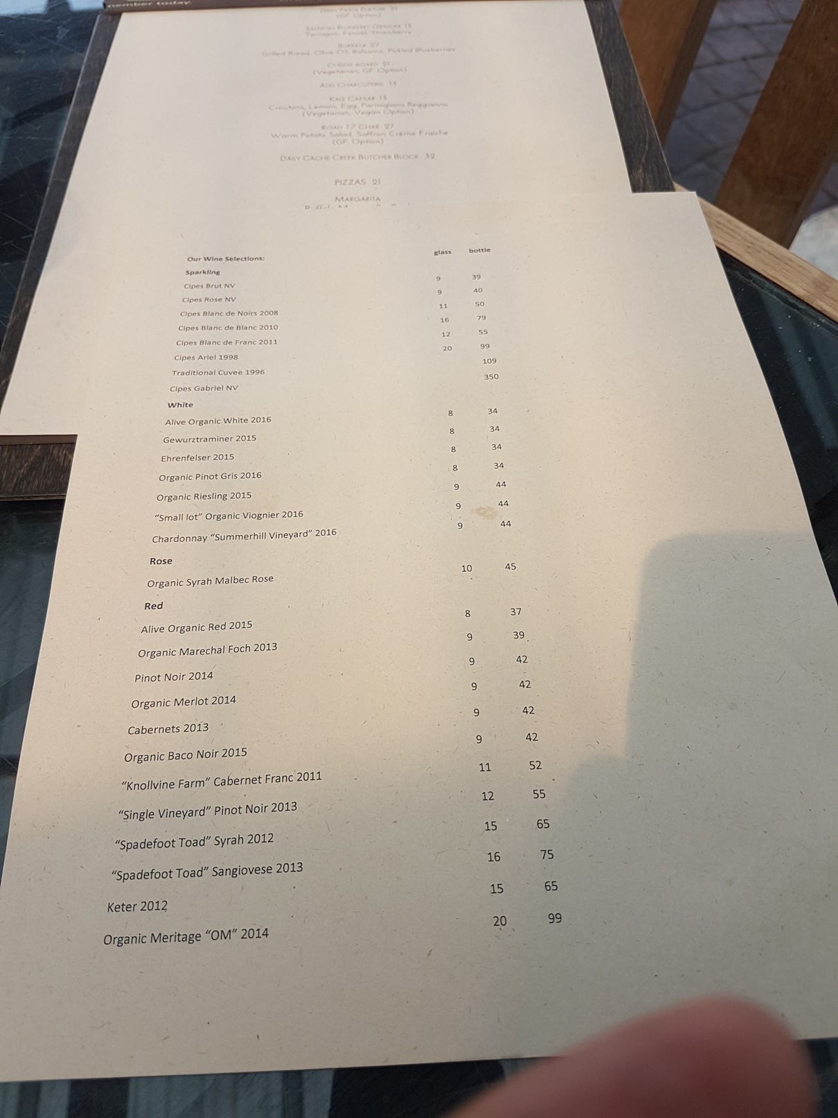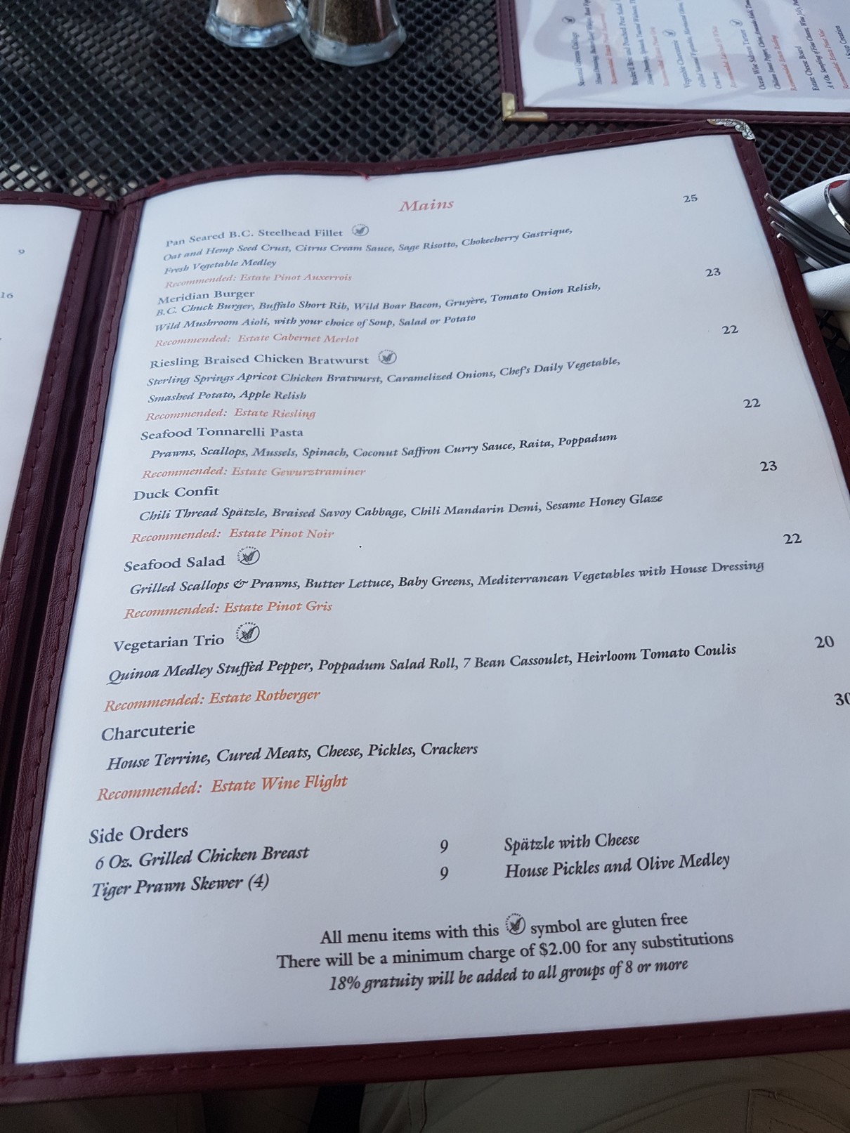 The wine list. Less expensive than the last place..that's for sure. We had the Syrah at $15.00 per glass. Pretty good. They even gave me a free glass because our food took so long.