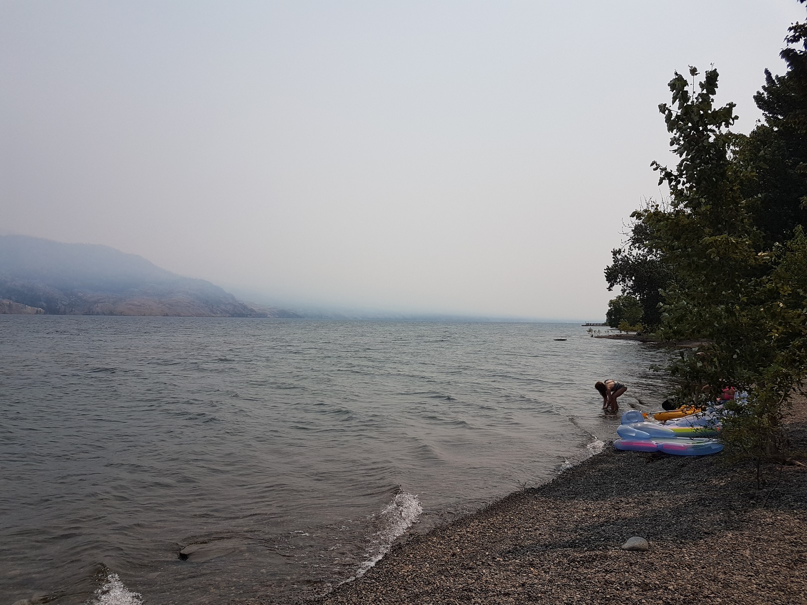 This is the lovely beach. That is smoke in the distance from all the forest fires we're having here in BC this summer. Double Bummer!!