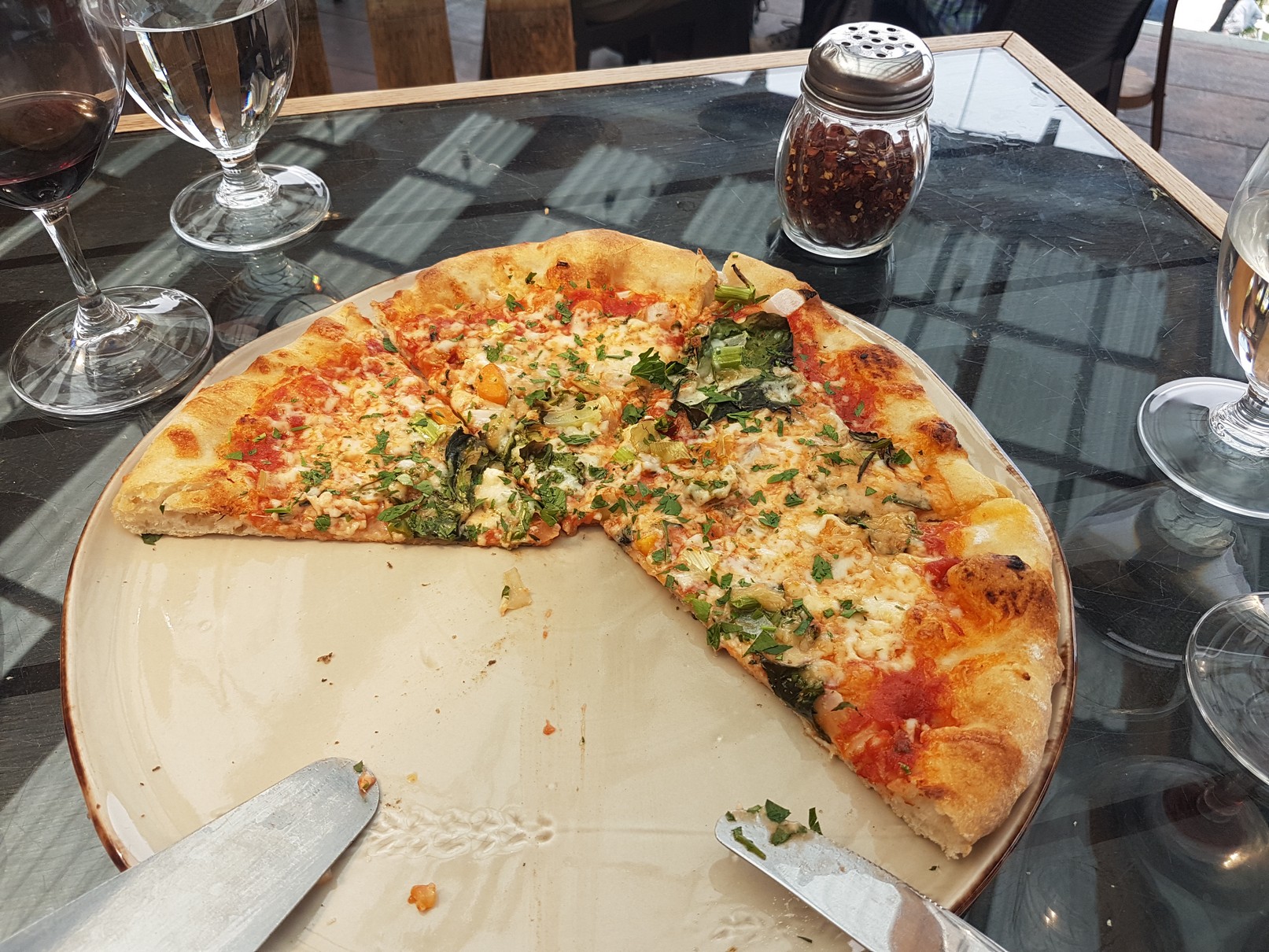 We just split the pizza...pretty darn good it was. Goat cheese and vegetables.
