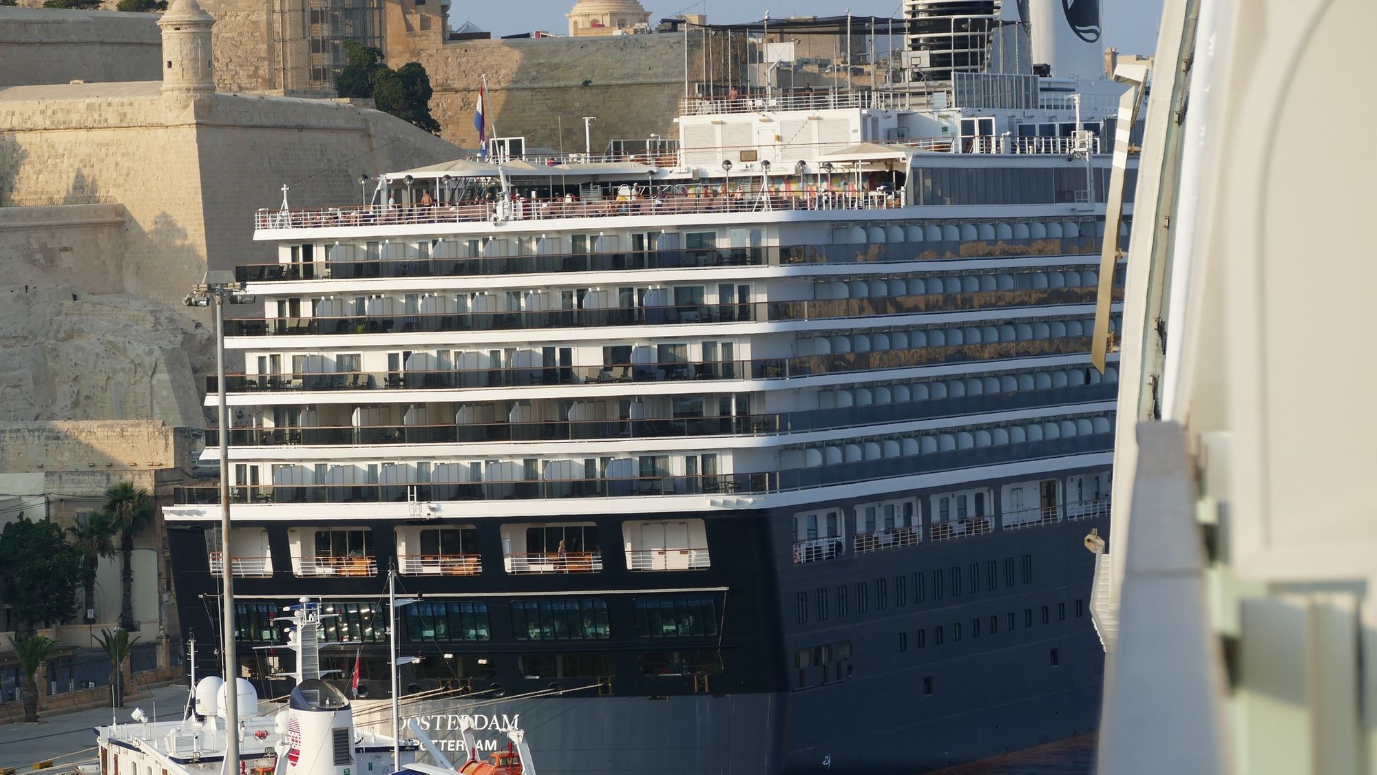 A huge liner is already here - the MS Oosterdam. A Holland America Line ship. It looks enormous but it holds less than 2,000 passengers which isn't anywhere close to the large liners of today. The Symphony of the Seas, a Royal Caribbean ship, holds almost 7,000 passengers and 2,200 crew. It is 16 decks high and would dwarf this ship.