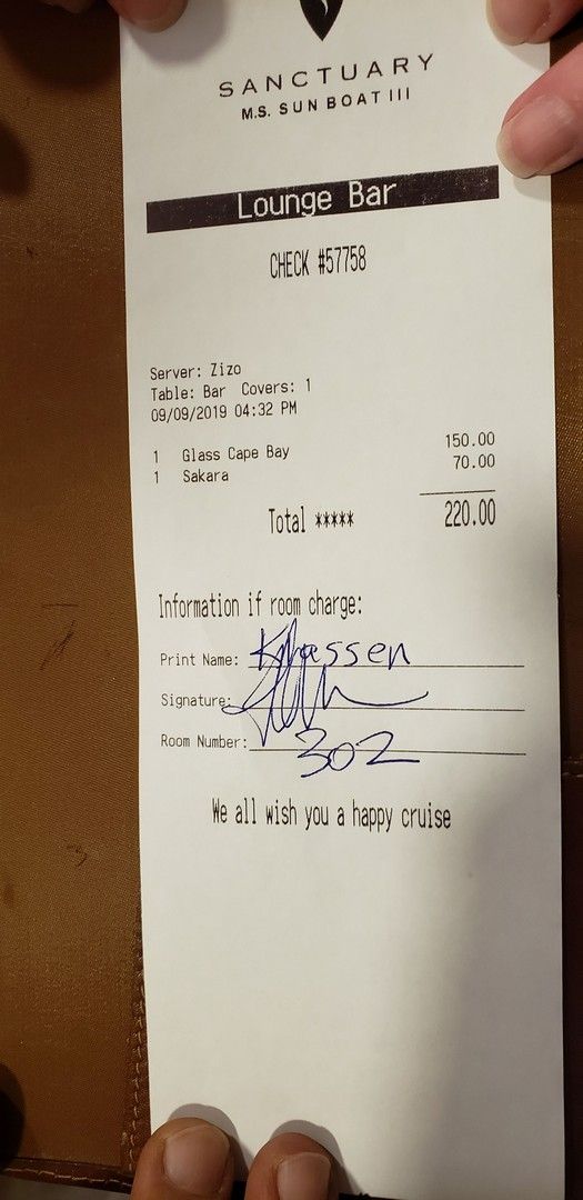 Liquor is not included on this cruise and below is our very first bar bill. There will be many more but not as many as I expected. More on that later.